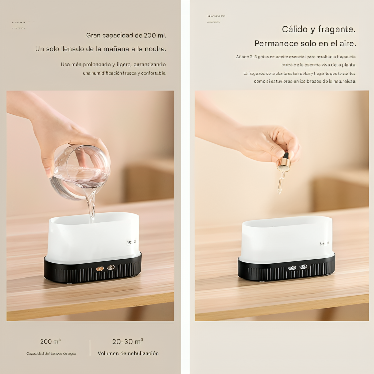 Ideal para hogares, oficinas, salones de belleza o espacios de relajación, este difusor crea un efecto visual de llama realista mientras llena el ambiente de fragancias naturales y humedad reconfortante.