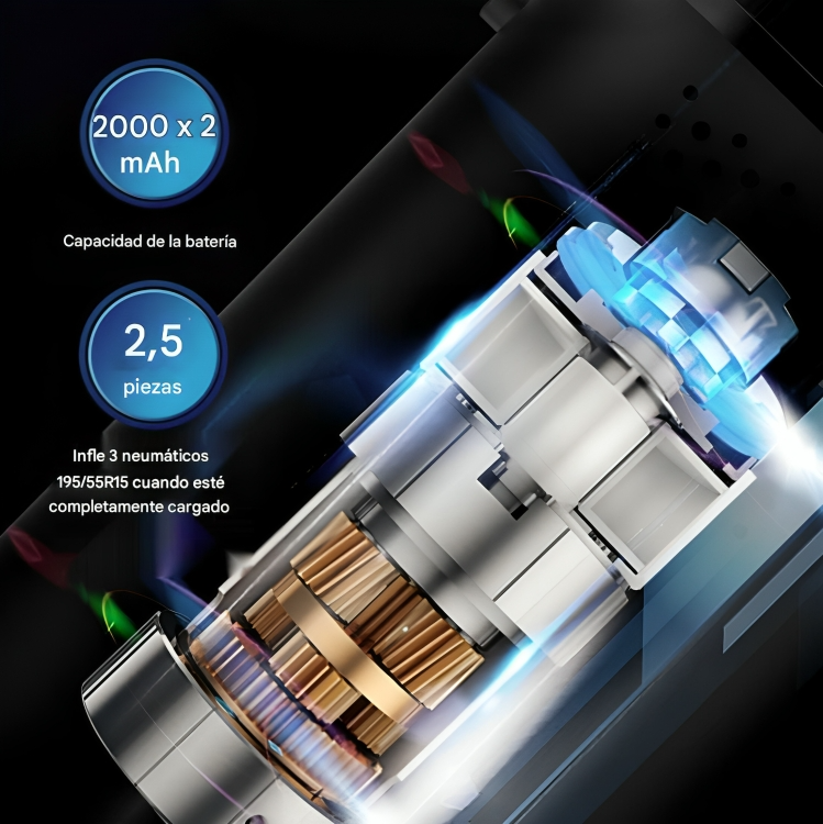 Gracias a su batería de litio recargable de 4000 mAh, el Mini Compresor ofrece inflados rápidos y eficientes sin necesidad de cables. Su presión máxima de 150 PSI lo hace ideal para todo tipo de usos cotidianos.